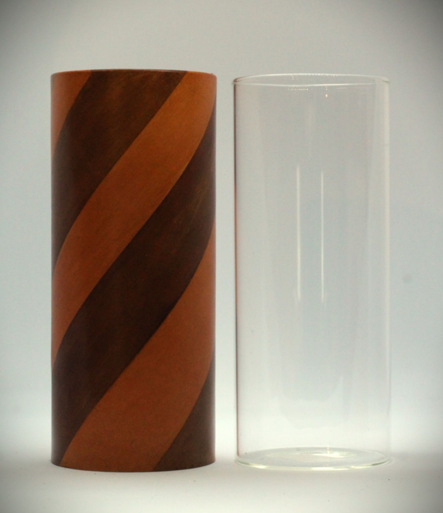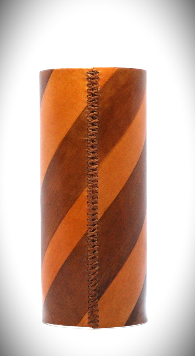 Vase cylindrique en verre recouvert d'une enveloppe en cuir amovible.